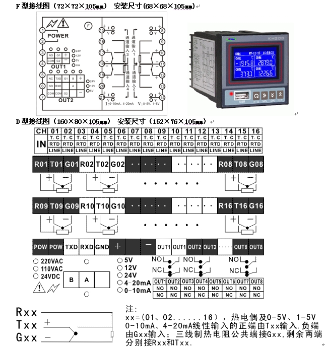 如:有一臺表的型號是:KH204BD-2RIA-P-U-I1;主機型號:KH204BD,外型尺寸:160×80mm,4通道小型藍屏無紙記錄儀,萬能輸入,帶兩個繼電器報警輸出,帶一路RS232打印接口,帶一個USB接口,帶一路變送輸出, AC220V電源。